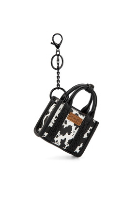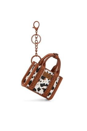 The mini Fun Size Tote is a delightfully whimsical accessory that captures the playful spirit of Western-inspired fashion in a pint-sized package. Crafted as a miniature replica of a structured tote bag, this charm dangles from a sturdy metal clip, ready to jazz up your full-sized purse, backpack, keys, or even a belt loop. Its standout feature is the exterior prints, adorned with bold, textured patterns like black-and-white cowhide, rustic brown braided weaves, soft pink cheetah prints, neutral leopard spots, and earthy shearling fringes, evoking a fun, ranch-ready vibe across six vibrant colorways: