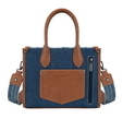 • Patchwork denim front panel • Contrast handles • Back feature pocket • Top zip closure • Detachable and adjustable crossbody strap • Internal zip pocket and slip pockets • Wrangler® logo badge
